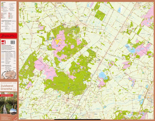 Een echte wandelkaart op wandelschaal en toch beslaat de kaart een fors gebied zodat de wandelaar lekker lange tochten kan maken. Op de voorkant van de kaart het het Dwingelderveld en op de achterkant Drents-Friese wold. Natuurlijk voorzien van alle knooppunten én 24 uitgezette wandelroutes